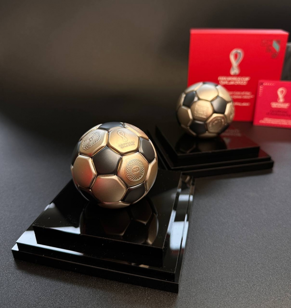 Ексклюзивна срібна монета у формі футбольного м’яча, присвячена Чемпіонату світу FIFA 2022 у Катарі.